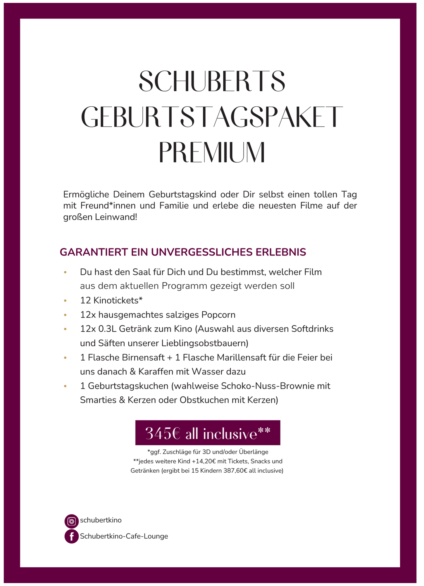 Feiere den Geburtstag Deines Kindes im Schubertkino und schaffe Erinnerungen, die ein Leben lang halten! Kontaktiere uns über das Kontaktformular, um mehr über unsere Angebote zu erfahren und eine unvergessliche Feier zu planen.
